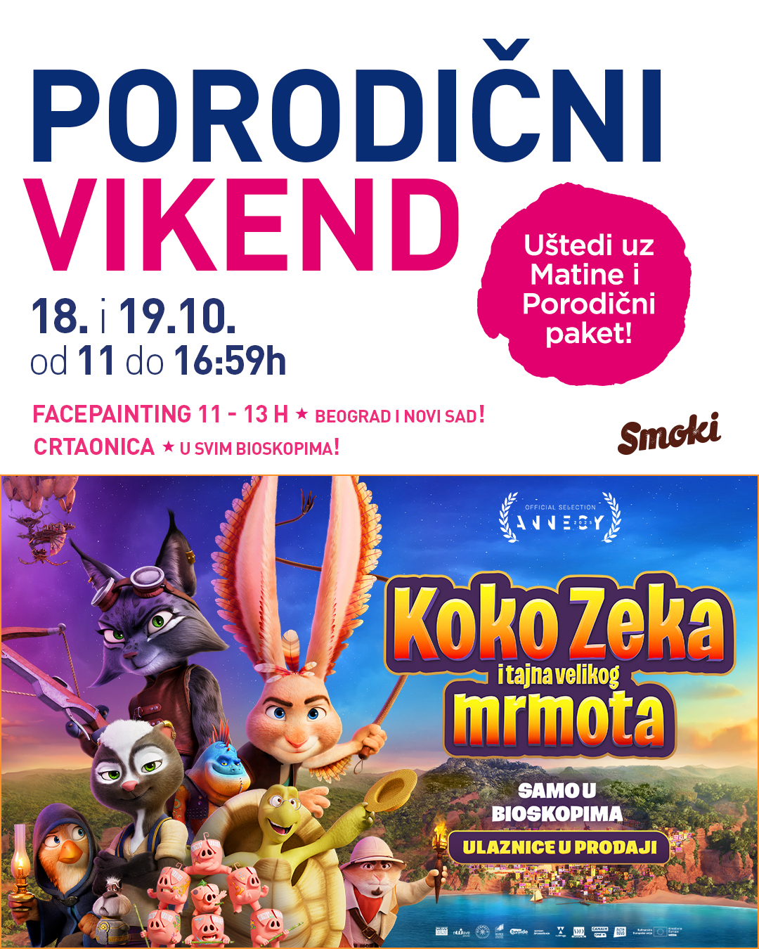 Uvek rado viđen Porodični vikend stiže u CineStar bioskope u Srbiji 18. i 19. oktobra 2025.od 11.00 do 16.59 časova uz najnoviji animirani hit KOKO ZEKA I TAJNA VELIKOG MRMOTA!U Beogradu, Novom Sadu, Pančevu i Zrenjaninu sve posetioce očekuje crtaonica, uBeogradu i Novom Sadu mališane će obradovati i Facepainting – crtanje po licu. Posetioci unedelju 19.10. u 16:30 …