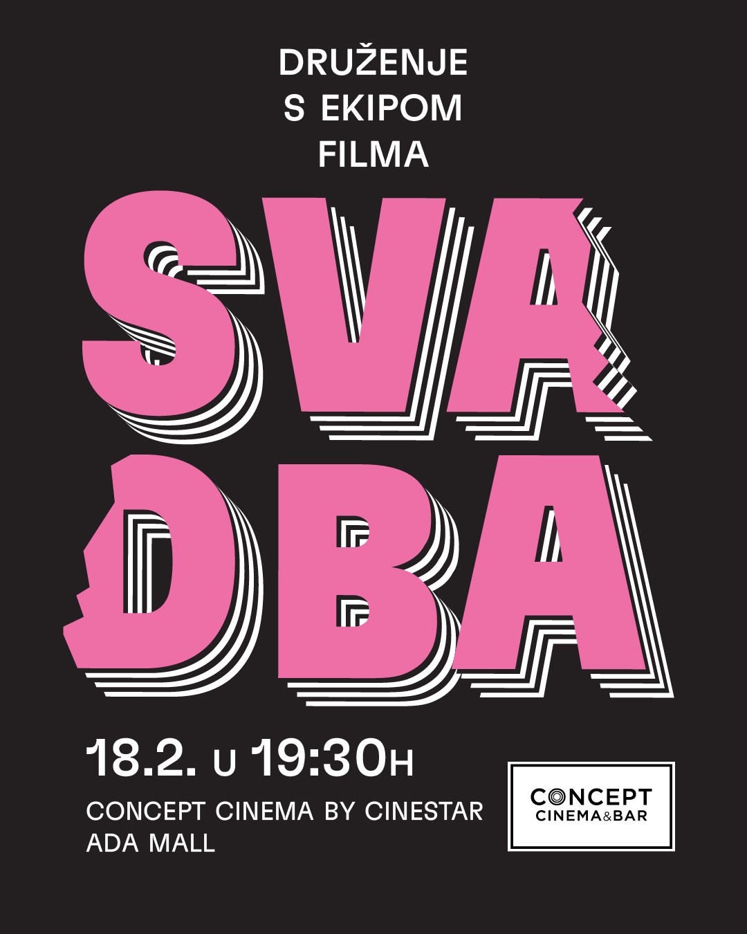 Dok film „ Svadba “ nastavlja da beleži izuzetne rezultate i dostiže nove regionalne rekordeposećenosti, ekipa filma dolazi u Beograd na susret sa publikom. U sredu, 18. februara u19.30, posetioci će imati priliku da u jedinstvenom ambijentu bioskopa Concept Cinema byCineStar u Ada Mallu upoznaju deo filmske ekipe i iz prve ruke čuju zanimljivosti i anegdotesa snimanja.